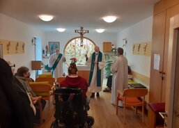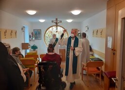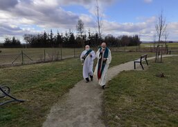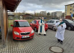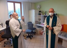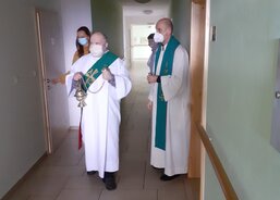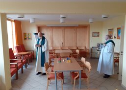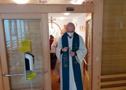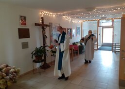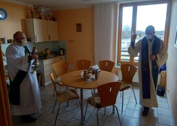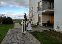 Duchovní správce farnosti Veselí nad Lužnicí P. Jan Skibiński dochází do Domu sv. Františka pravidelně každý čtvrtek dopoledne a slouží v místní kapli mši svatou pro obyvatele a pracovníky. Po včerejší bohoslužbě otec Jan požehnal Domu sv. Františka, všem jeho klientům i pracovníkům, nezapomněl ani na automobily nebo zahradu. K otci Janovi se přidal také jáhen Tomasz Zbucki, který v Domě sv. Františka již třetím rokem bydlí. Děkujeme za toto dobrořečení!