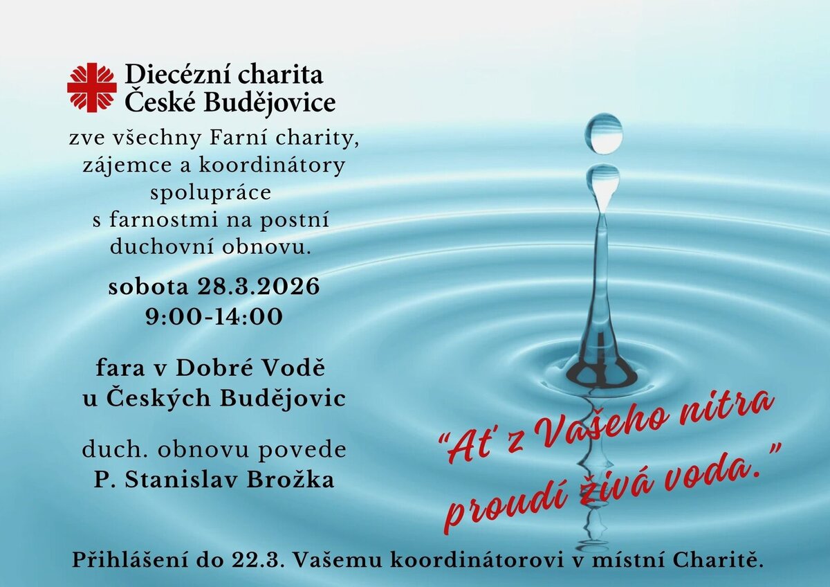 Diecézní charita České Budějovice zve všechny Farní charity, zájemce a koordinátory spolupráce s farnostmi na postní duchovní obnovu.